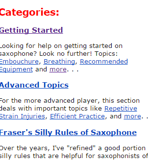 RyanFraser.com is the website to learn playing saxophone which has all the lessons categorized in such an order that you’ll be able to find one matching your level easily. The website is run by Ryan Fraser who is a Canadian saxophonist, winner of Canadian Music Competitions (1995) and winner of Chalmer’s Grant in 1996. All of the saxophone lessons are categorized under Getting Started, Advanced Topics, Fraser’s Silly Rules of Saxophone, and Fraser’s Recommended Listening. You have to choose the category as per your proficiency level.