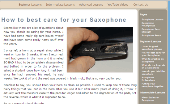 Saxophone-Lessons is the last website in the list to learn how to play saxophones. The website has 4 sections: Beginner Lessons, Intermediate Lessons, Advanced Lessons, and YouTube videos. Click on the section matching your skill level and start following the tutorials. All the lessons provided by the website are text-based except for the ones included under YouTube video category. There are no other options available on the website, just choose your desired category and start learning.