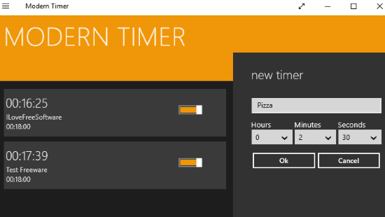 Modern Timer is a free Windows multi timer app to set multiple timers at once. This app is also very simple and doesn’t offer much of the additional options as compared to other multi timer apps for Windows 10 in this article. You can simply add multiple timers with their labels and make them count at the same time. It doesn’t give you the option to set different notification sounds for different timers. It plays the same notification sound for all of its timers. This app can display the total number of active timers on its Windows Taskbar icon. I really liked this feature as a user can quickly know about how many timers or tasks are active currently. To add a timer, click on the big yellow Add button. After that, you will see the options to specify the label and duration of the timer. You can make a timer count up to 23 hours 59 minutes 59 seconds. Click on the OK button to create the timer. Now you can start the timer from the main screen of this app. Toggle the ON button on a timer to start it.