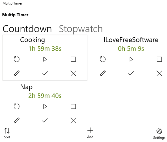 Multip’Timer is a free Windows 10 PC app to set multiple timers at once. What separates it out from other Windows 10 apps on my list is that in addition to multiple timers, you can also add multiple stopwatches on it. This multi timer Windows 10 app also doesn’t give you the option to set a custom notification sound for different timers. It is a very simple app, on which you can add as many timers and stopwatches and make all of them run at once. To add a timer, click on the “+Add” button. After that, specify the title of the timer and its duration, click on the “✔” button. The timer will be successfully created and you can start it from the app interface.