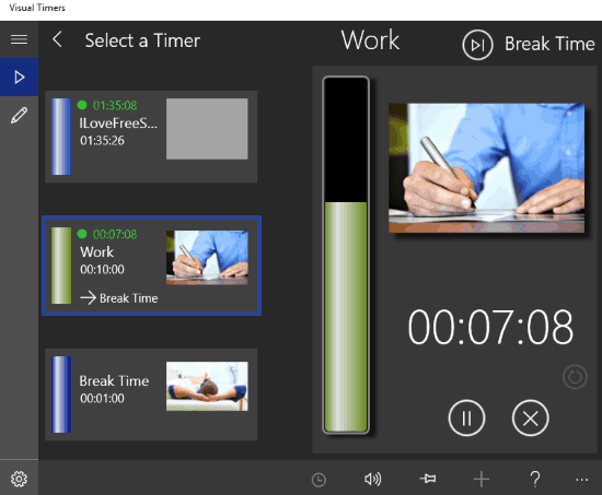 Visual Timers is the last multi timer app for Windows 10 on my list. As its name suggest, you can add photos or visuals to a timer in this app, as you can also see in its screenshot above. In addition to this, it also visually displays the timer counter progress. You can add multiple timers for your different tasks and make the timers count at once. It lets you set a timer up to 12 hours 59 minutes 59 seconds long. In addition to this, you can even select an audio file from the PC to set as sound for the desktop notification which gets displayed after a timer runs out of time. You can also add a photo to depict the timer for the task you are creating it for. It also lets you specify a timer which will be started automatically after the timer being added goes off.