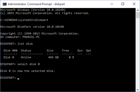 Step 5: Enter select disk followed by the disk number. In my case, I will enter select disk 0 . Similarly if you want to enable it for disk 2, 3, or so on, enter select disk # where # is the disk number.