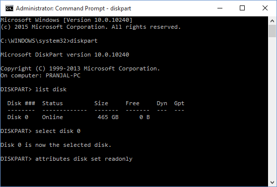 Step 7: Your disk will now be write protected – i.e., accessible in readonly mode! Congrats!! If you now wish to disable write protection in future, follow all the above steps upto Step 5, and in place of step 6, type attributes disk clear readonly and press enter.
