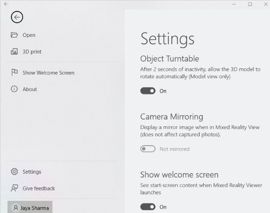 On this page you can change a couple of things, like you can turn off the welcome screen you saw at the beginning of the app. You can turn off the object turntable mode where the 3D model starts rotating after 2 seconds of inactivity. Camera mirroring can also be turned on or off.