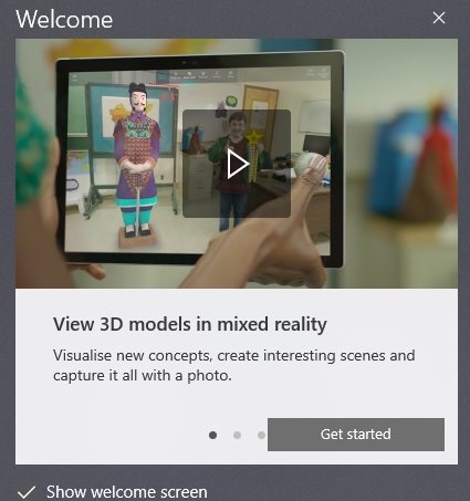 Download the app from the Windows 10 store and open it. You will get a welcome screen as shown in the screenshot below. The welcome screen will have small introduction type video to show you what the app is capable of. Once you are ready click the get started button.