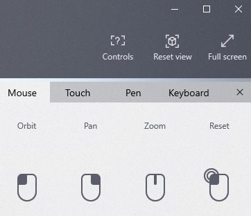 The controls for editing are seen in the top toolbar. From right the first option is to go into full screen mode, the second option is to reset the view of the 3D model, and the third one shows controls for your mouse, keyboard, pen, and touch screen devices. The controls option can be seen in the screenshot below.
