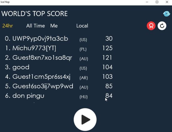 Your current score and best score will be displayed at the top of the window. The play button will immediately start the game for you. The blue icon along side the play button is the leaderboards icon where you can view rankings.