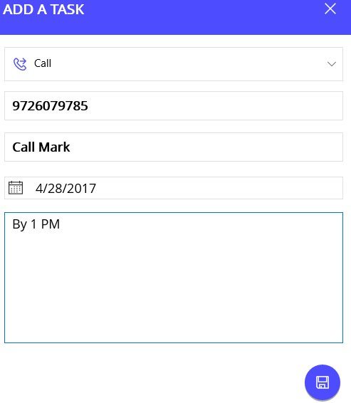 To add a task just click on the plus icon on the screen under tasks. A window like the one shown above will open up. Here you can easily add a reminder for any task. At the top of the page define what kind of a task is this like a call, email, some schedule, etc. Once you have done that then give a title and description to the task and add a date or time you have to complete it by. Then click the save button to save this task.