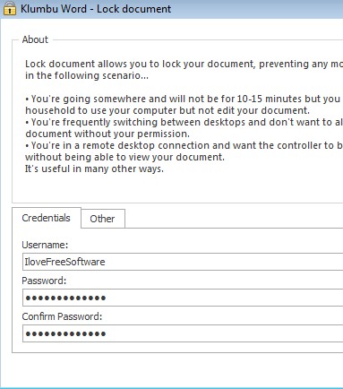 Clicking that will open up the Lock document window, where you can add password protection to your files. If you leave your document running without activity, you’re gonna be asked for the password. This is so prevent strangers sitting behind you computer and reading/editing your document when you’re away. Don’t forget to save your work when you’re done editing.
