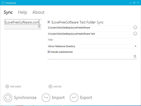 Job name, source directory, target directory, synchronization method, filters can all be set using the options on the right. If you want, it’s possible to sync several directories at once. Just click on the Add job button and go through the setup again only now set different directories and files that you need synced.