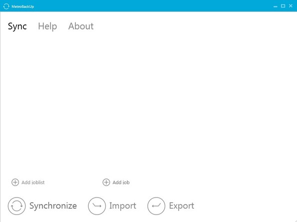 Interface of MetroBackup follows the new interface design of Windows 8, but this is not a Windows 8 app. Design is simplistic with menus being available in both the top and bottom left corners. Empty area between the two menus will hold a list of file synchronization jobs that you setup. Multiple directories can be synchronized at once, batch synchronization is available.