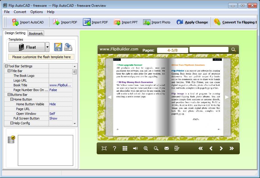 Flip AutoCAD is a very useful tool if you want to create a professional looking flip book publication of your AutoCAD designs. Large number of formats is supported, and the flipbook is highly customizable. Conversion is very fast, if you opt out for the standalone EXE format, you can run it without any kind of installation. Click here to download it. You may also try HTML to Flipbook reviewed by us.