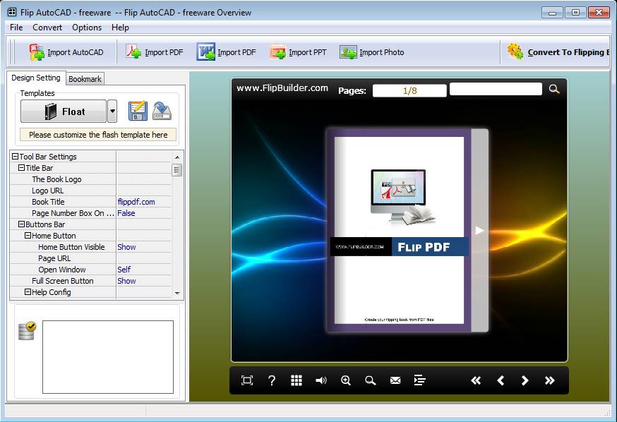 Left sidebar of Flip AutoCAD has everything necessary for adjusting the appearance of the flip book that you’re creating. At the top of the window you can see a classic menu while beneath it there’s an even larger menu where you can start the document import dialog. Notice that next to CAD designs, you can also import PDF documents, PPT presentations, and regular photos and create flip books, but note that this is only possible in the full version of Flip AutoCAD.