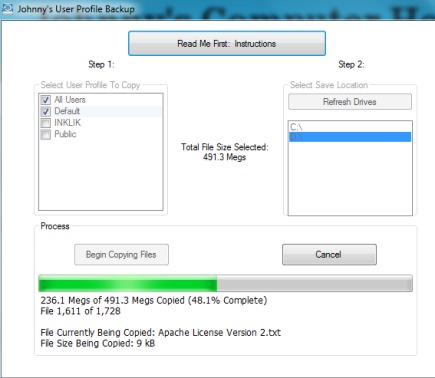 Johnny’s User Profile Backup is a nice software. Although you can backup user profiles manually as well. But using this software, you only need to select a user profile and backup drive. No extra efforts are required. If you want to try this software, get it from the link below: