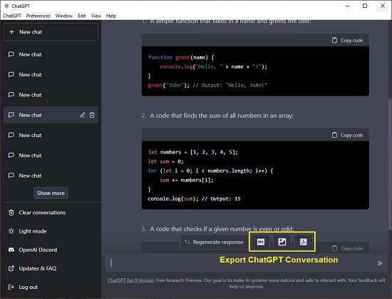 5. Once you get a response, you can click on any of the 3 buttons adjacent to ‘Regenerate Response’ to export the current ChatGPT conversation in the Markdown, PNG or PDF format.