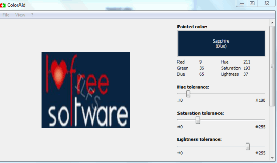 ColorAid is a free color analyzer software that helps to highlight pointed color of an image opened in its interface. It also shows the name of pointed color that will increase your knowledge about the colors. Placing the mouse cursor over a pixel of added image will highlight and flash same or related colors available in that image. It will also show the name of color immediately. You can also capture a screenshot using this software and find out its color information.