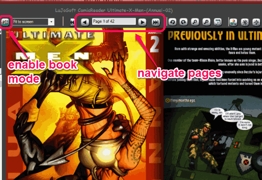 At the top, you can use buttons to navigate pages. Or else, click on a particular thumbnail to open the required page. If you want to view two continuous pages of your comic, simply enable Book Mode using available button.