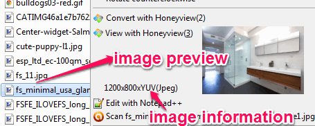 Its context menu integration provides multiple features. You will be able to preview an image by right-clicking on it which is helpful when image is in list mode or in any other mode (except thumbnail). It also provides an option to convert that particular image with Honeyview. But to convert images, it will open interface of this image viewer.