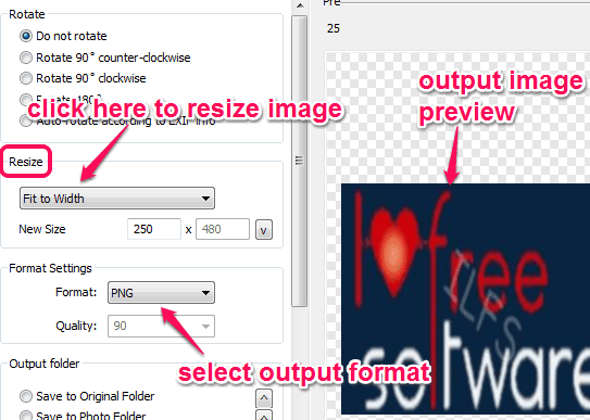 Left side of this window provides all the options. You can select png or jpg format as output and can also rotate image to 90 degree, -90 degree, and 180 degree. To resize the image, it lets you enter custom size or use presets.
