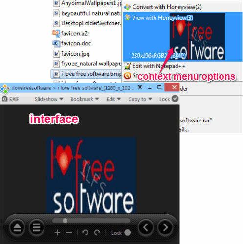 Honeyview is a free image viewer software that helps to view images as well preview images using its context menu option. It integrates with Windows context menu and provides image preview option in context menu box. It also comes with unique feature to view images present in an archive (rar, 7z, or zip). You don’t have to extract the zip file and can open all images directly by adding the zip archive on its interface.