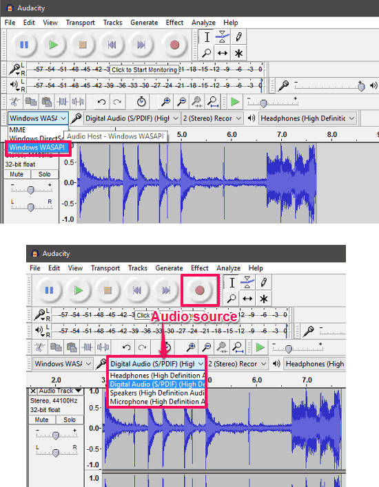 It’s pretty easy to configure Audacity to record any PC audio. If you don’t have Audacity on your PC, then you can get it from the link. When you launch it, navigate to the Audio host drop down and choose “Windows WASAPI” from it. After that, specify the audio source using the Audio source drop down. Select the installed audio device of your PC. In my case, the device name is “Digital Audio (S/PDIF)”. After specifying these parameters, you can start recording by hitting the record button. And when you are done, stop the recording and save it as a file.