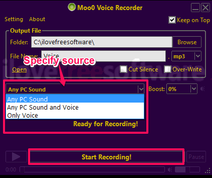 Getting started with Moo0 VoiceRecorder is pretty easy. Grab its setup file from the above link and then install it on your PC. When you launch it, you will see its interface, which has the options to configure it. To make it record any PC audio, choose Any PC audio from the drop down. After that, provide the output path of the recorded file and file format. Once you are done with it, simply hit the Start Recorrding Button to start recording any sound coming from the PC. And when you stop the recording, then you can hear it using the Play button, and the file will automatically save to the output path.