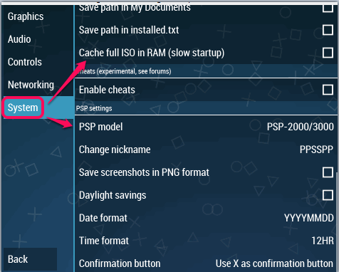 - There are many ‘System’ options that you can adjust to optimize this emulator for playing the game uninterruptedly. For example, you can enable fast memory option, change emulated PSP’s CPU clock, select PSP model (1000 or 2000/3000), etc.