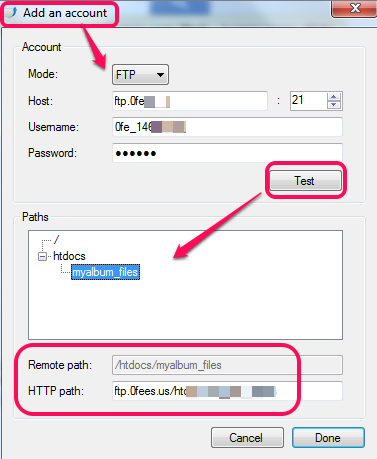 Step 3: Now you need to click on Test button. This will check whether the FTP address is correct or not. If it is correct, your account will be connected. See the above screenshot. Folders present in your FTP server will also be visible to you. You can select any folder to which you want the screenshots to be saved. Save settings using Done button.
