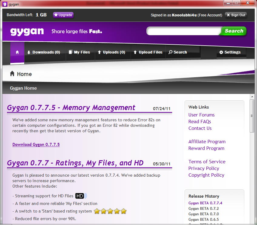 GyGan has a stylish interface that is similar to eMule or Limewire. At the top of this free video sharing app, there is the search box and there are many other options in the screen that help you upload, stream or download a file. The interface is user friendly and is very attractive to look at.