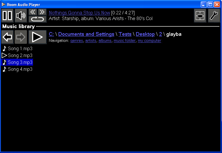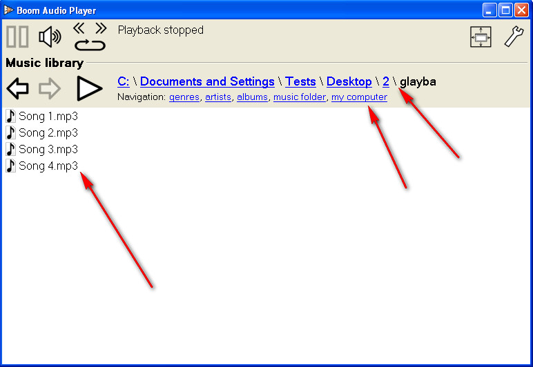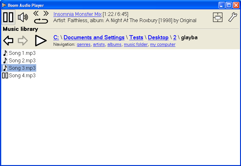Clicking on My Computer will open up the partition selection window, and from there you can navigate to your music folder, after which all the music files in that particular folder will become listed and they will become available for listening. List of audio formats that Boom Audio Player supports is rather long, which is a great thing, it means less hassle with conversions if for example music player that you normally use doesn’t support the music format in which you copied songs from your friends. Supported formats are: