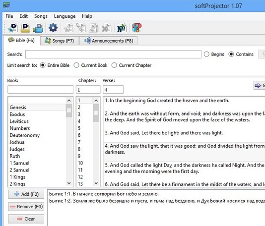 softProjector is perfect for people who have to quickly and easily find Bible verses so that they can be shown and projected on the screen. Church masses, Bible studies, lectures will find that softProjector is just the thing that they need. Make sure that, if you decide to use this free Bible presenter, that you open up the Announcements tab in case that you need to project something other than Bible verses or songs of praise. With Announcements, you can even use softProjector for other lectures.