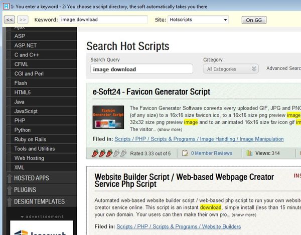 Use the search bar at the top in order to tweak your search. We searched for image download related code on Hotscripts and as soon as you set the Site option from the drop down menu at the top, you’re gonna see the code snippet results posted back down below.