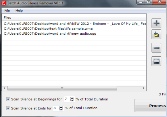 Batch Audio Silence Remover is a free software that helps to remove silence from multiple audio files together. It simply scans silence at the beginning and end of input audio tracks and removes silent part(s) automatically. You can also set percentage of scanning area. For example, you can set 10% to scan silence at the beginning/end of total duration of audio files.