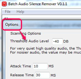 Leave all options settings by default if you are not sure about correct input value. Otherwise it will result in an error while analyzing the input files for processing. If you want to use, then access Options present in File menu to set audio threshold value and attach & release time.