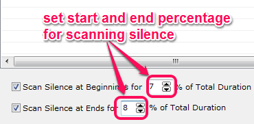 Step 2: After adding the audio tracks, you can set silence scanning percentage for beginning and end periods of input tracks. By default, it is set to 5% for both ends. But you can increase decrease this value according to your need using available buttons.