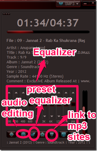 SMP3 is a free mp3 player that can play audio files and audio of the video files but video is not supported, comes with a stylish interface and lot of equalizers that can play your song differently. You can save the playlist, even export them as html link.