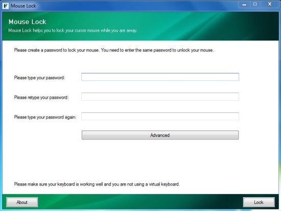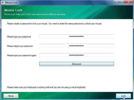 The app opens as a plain window displaying three text boxes for entering password. You can choose a custom password and enter it three times to create a password protected lock for your mouse. After entering the password, you can simply press the “Lock” button to lock your mouse pointer immediately.