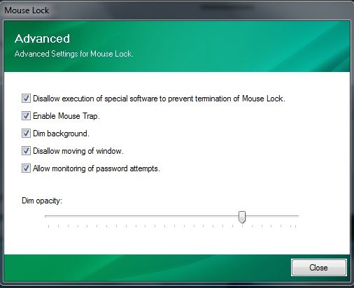 There’s also an “Advanced” button present below the password textboxes on the program interface that opens an “Advanced Properties” window that contains options to enable/disable dim background, disallow moving of window, allow monitoring password attempts, setting the dim opacity, etc.