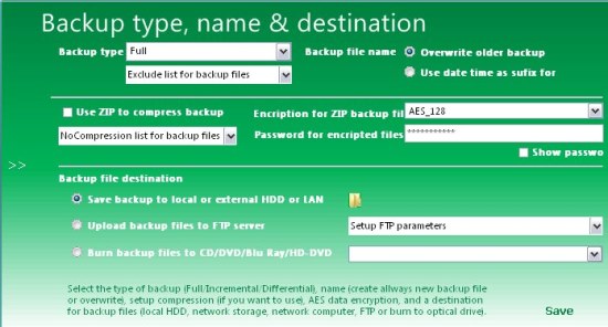 - Multiple destination options for keeping backups: local or external drive, CD/DVD, network, USB disk, and FTP server.