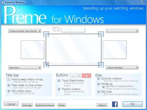 Preme for Windows makes it easier for you to manage different application and program windows with quick mouse gestures. Like for example, you can close any open window just by pressing mouse wheel on its title bar, open windows switcher in Aero Flip 3D or Alt-Tab style just by pointing mouse cursor to a screen’s corner, or set any window to stay on top with a long left mouse key press on its title bar.