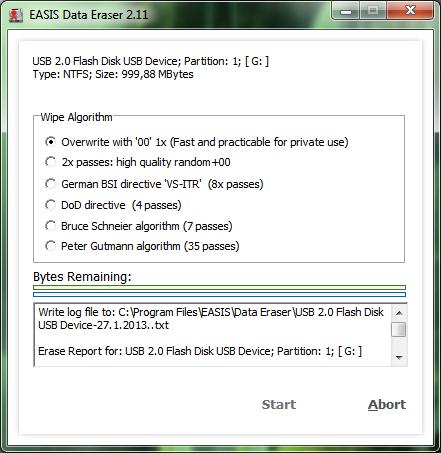 When you choose the algorithm you simply need to click the Start button to start erasing the data from your disk drive securely. Note that this process will take some time, possibly hours to complete. If you change your mind you can abort the process anytime you want by simply clicking on the Abort button. When the process of erasing data from your disk drive is complete, this window will close and you will be reverted to the main window.