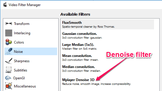 Step 2: When you do that, a popup window will open up with all the supported filters. Now, select “Noise” on the left of the window and then you will see the denoise filter named, “Mplayer Denoise 3D” on the right.