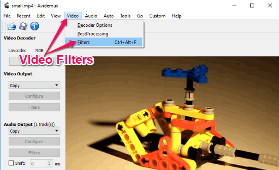 Step 1: To get started, simply launch Avidemux and select “File → Open” at the top menu to import the source video. You can import different video files like MPEG, AVI, MP4, MKV, etc. for denoising. After importing the video, simply click on the “Video” menu and select “Filters” from the list.