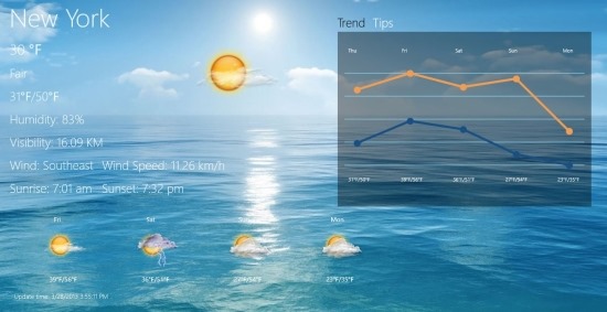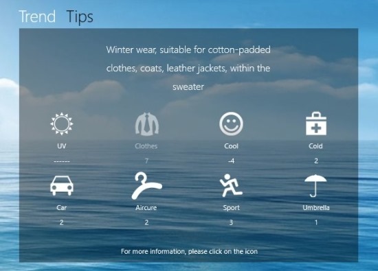 Now if you switch to the tip tag from trend, then small window will display tips related to clothing, sports, need of an umbrella etc. as shown in the above screenshot. Personally I just love this feature of the app and the tips that it gives are quite useful and makes this weather app for Windows 8 a little unique.