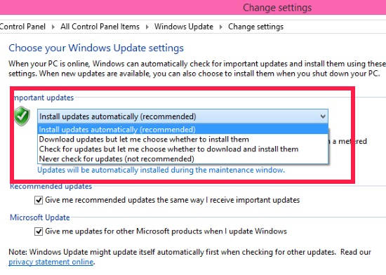 Step 3: In next window, navigate to important updates. In the list, it will give you four options. By default, the setting says “Install updates automatically”. Choose the option that says “Check for updates and let me choose whether to download and install them”. You can choose any other setting as well, depending upon your preference.