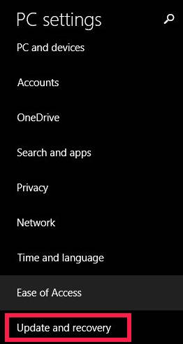 Step 1: Open PC settings. To Open, use Windows Key + I, and then click on “Change PC settings”. In PC settings, click on “Update and recovery”.