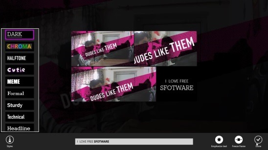 Now, it’s time to add effects on the clips. Once you clicked on Split, simply click on the callout, present on top Start slider. Doing this lets you add 16 different textual effects on clips. Just add the text in text field, and click on Styles button. This opens the list of available text styles in the app. My favorites includes Modern, Halftone, and Handwritten. Plus there are two more effect buttons on the right side of the bottom ribbon: Emphasize text and Freeze frame. Add the effects and click on Done.