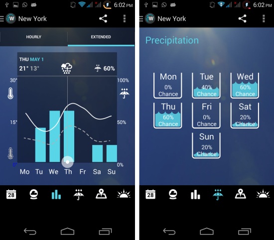 In the next section of the app you get graphs of extended and hourly forecast. They graphs are very simple to read and provide a quick way of seeing the forecast. Also 1Weather for Android shows you the precipitation chances, as seen here.