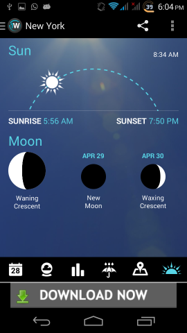 In the last tab of the 1Weather for Android you are provided with the information about the sunrise, sunset, passage of the sun, and information about the moon as well.