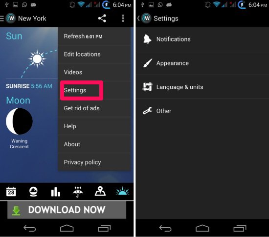 Settings in 1Weather for Android: